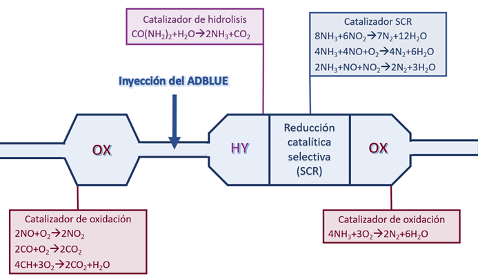 Amikor az AdBlue kapcsolatba kerül a forró gázokkal, ammónia szabadul fel, amely elősegíti a katalizátorban lejátszódó reakciót, és a nitrogén-oxidokat szabad nitrogénné és vízzé alakítja. Az SCR, egy kibocsátáscsökkentő technológia, a nitrogén-oxidokat (NOx) molekuláris nitrogénné (N2) és vízzé (H2O) alakítja át egy katalizátor és egy gáznemű redukálószer, általában ammónia segítségével, amelyet a motor kipufogógázra alkalmaznak.